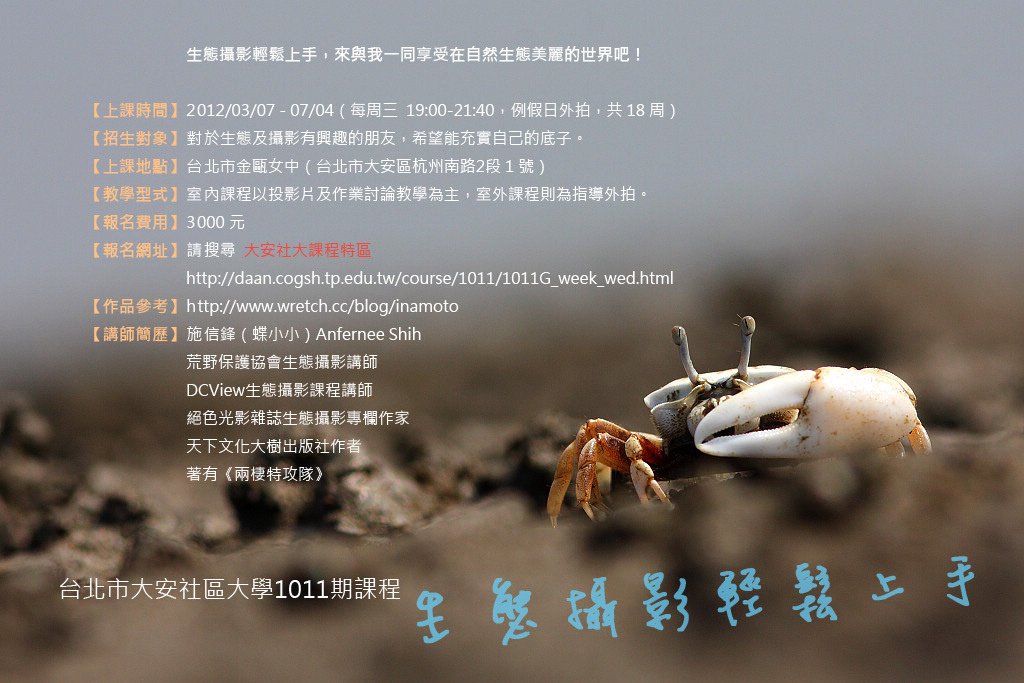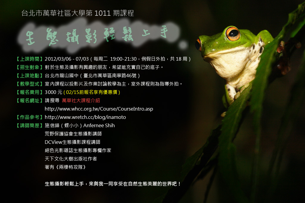 講授「生態與攝影」對我而言並不陌生;而這是我第一次在社區大學開講「生態攝影」!